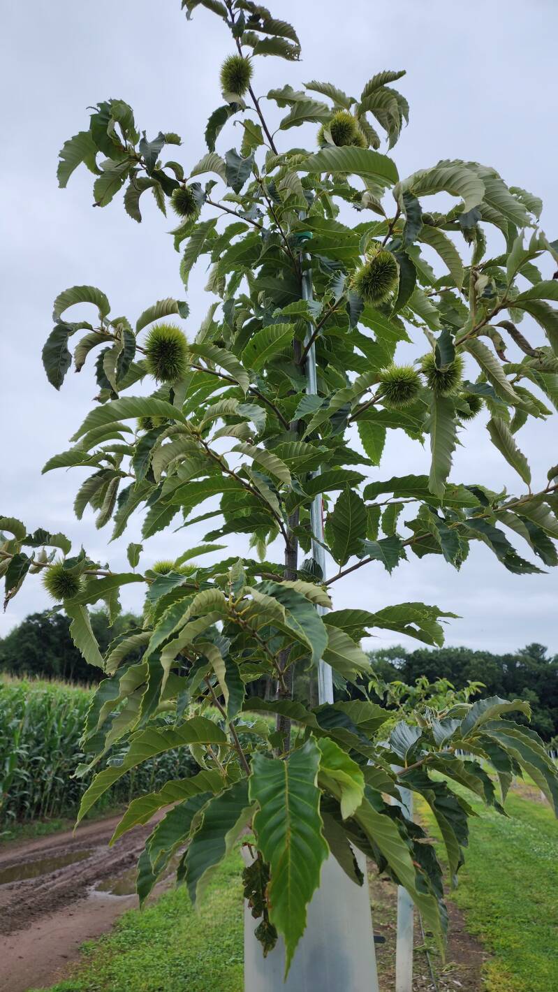 Our young trees are producing nutritious chestnuts. Chestnuts are a good source of fiber, which has many health benefits.